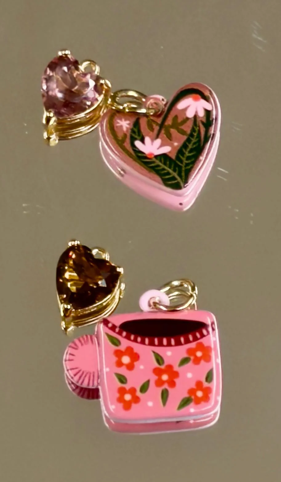 Un ciondolo che racconta intimità e calore: una tazza rosa dipinta a mano, decorata con fiori arancioni e foglie verdi, come un piccolo giardino segreto.