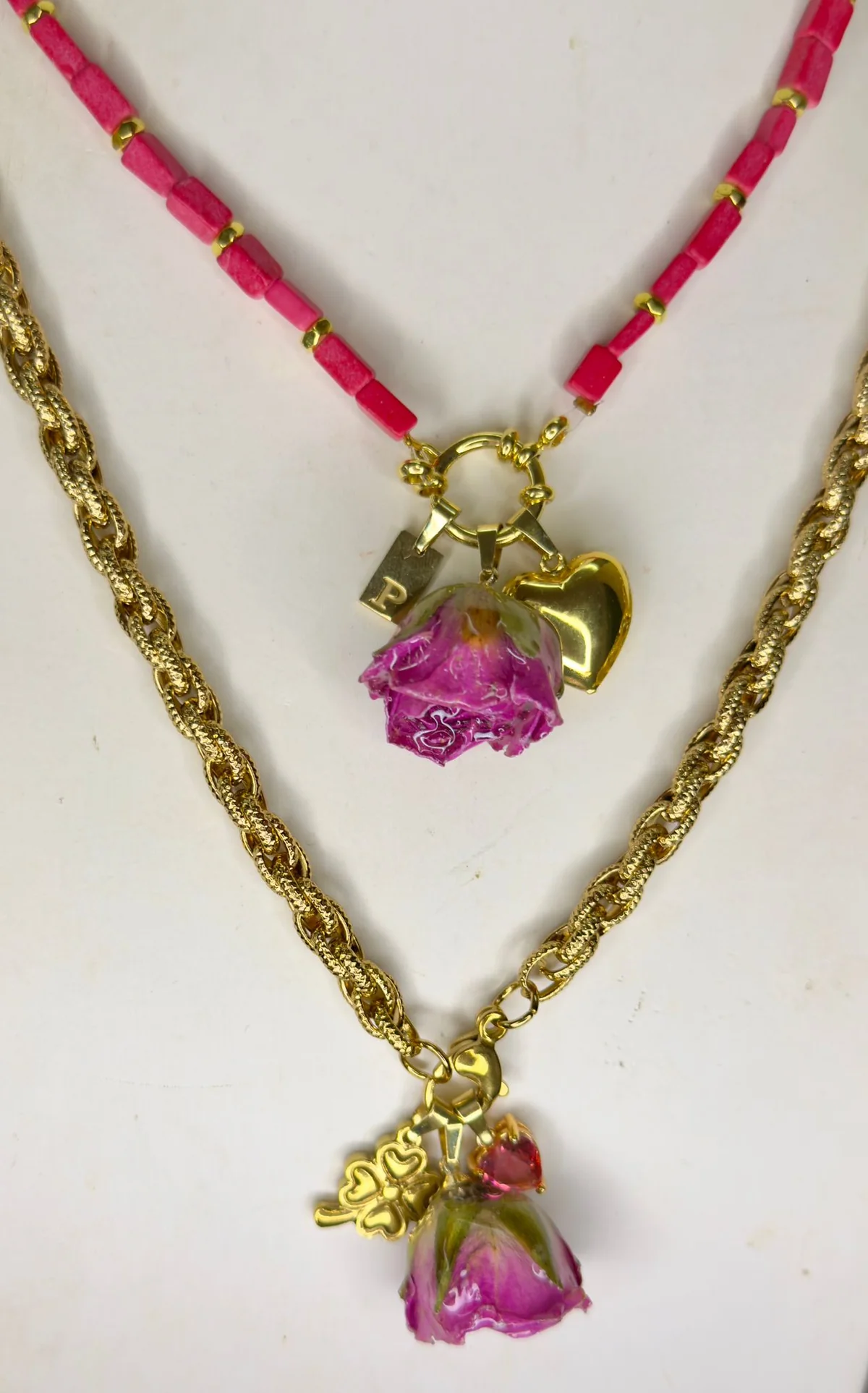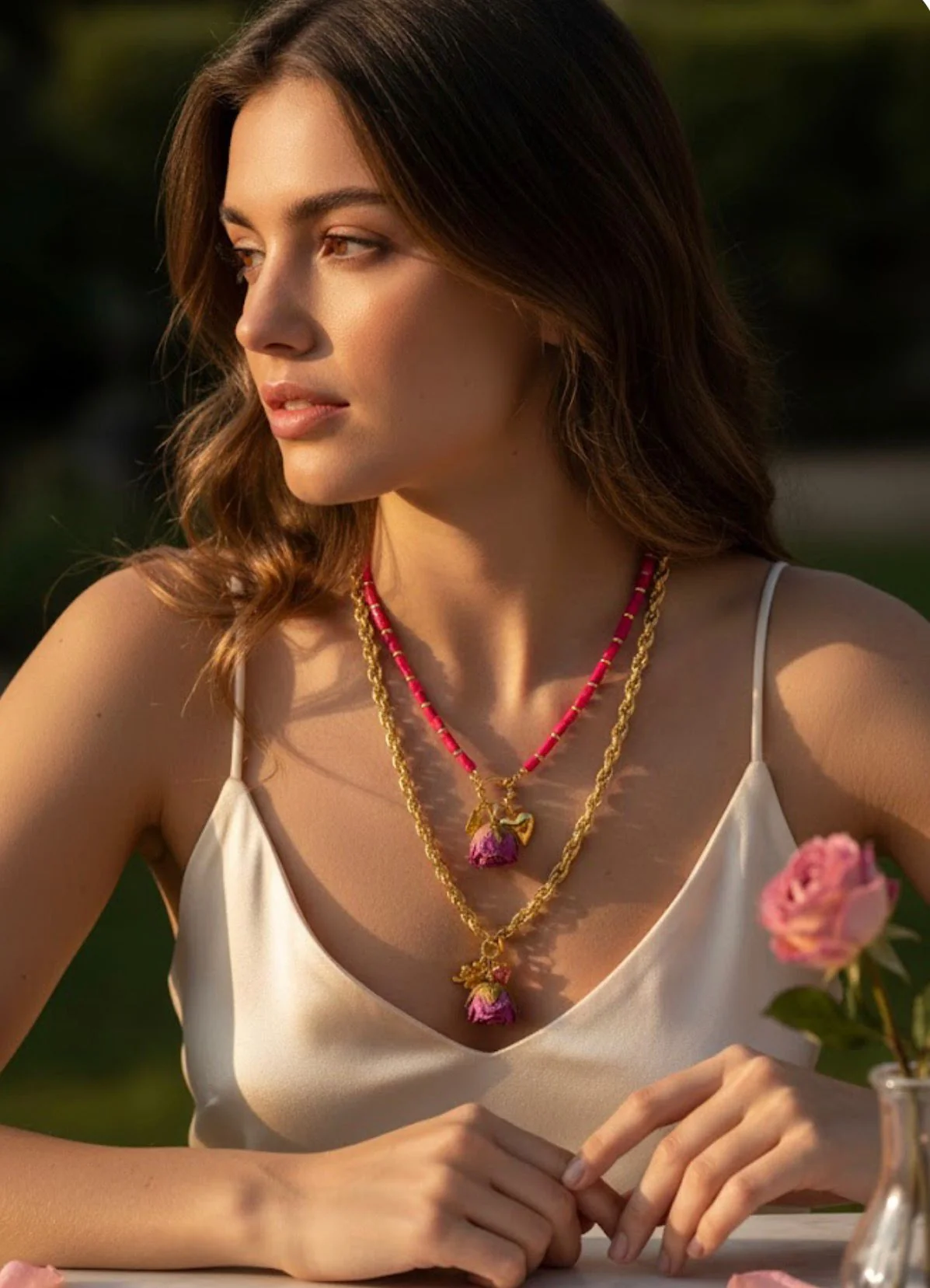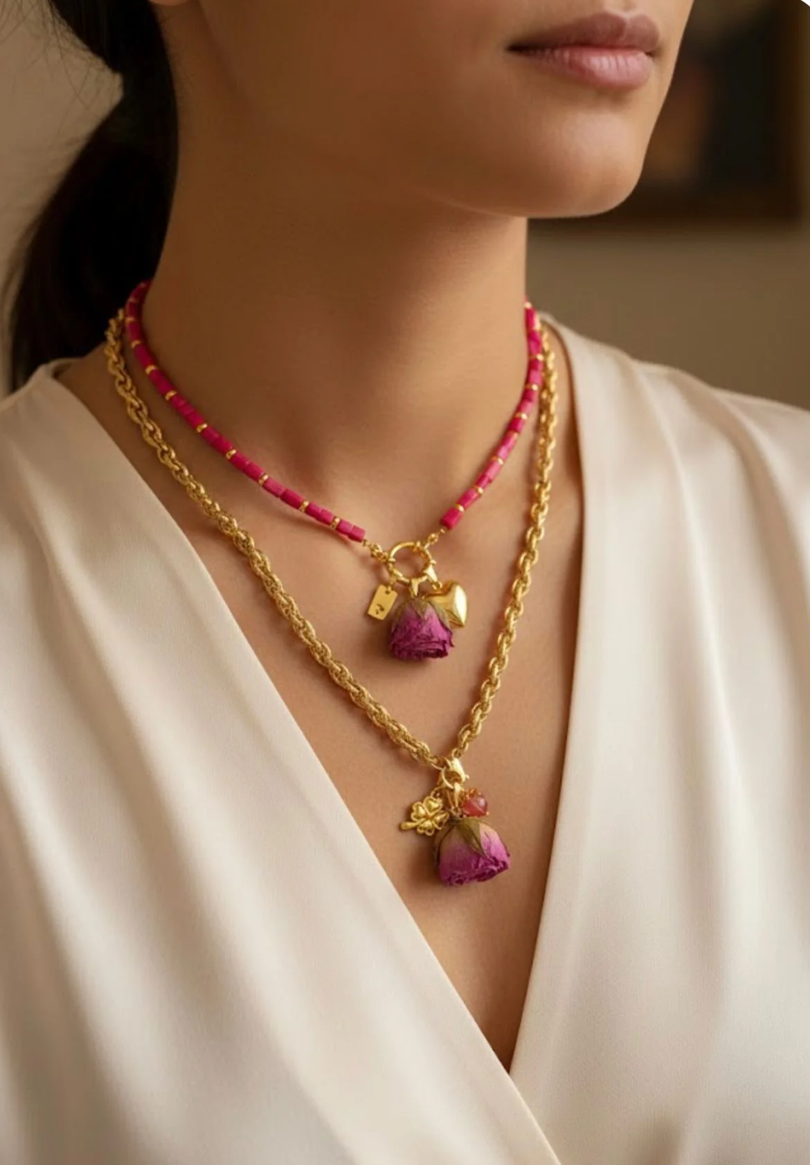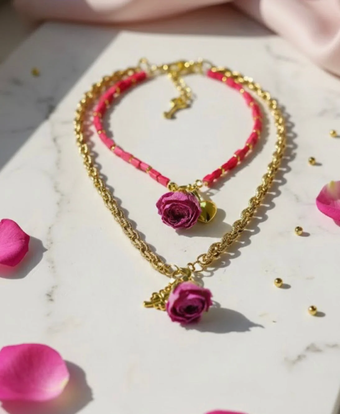 La Linea Eterna nasce dall’incontro tra artigianalità e natura: ogni collana custodisce una vera rosa cerata, lavorata con un lungo processo di conservazione e poi racchiusa in resina trasparente, così da mantenere intatta la sua bellezza nel tempo.