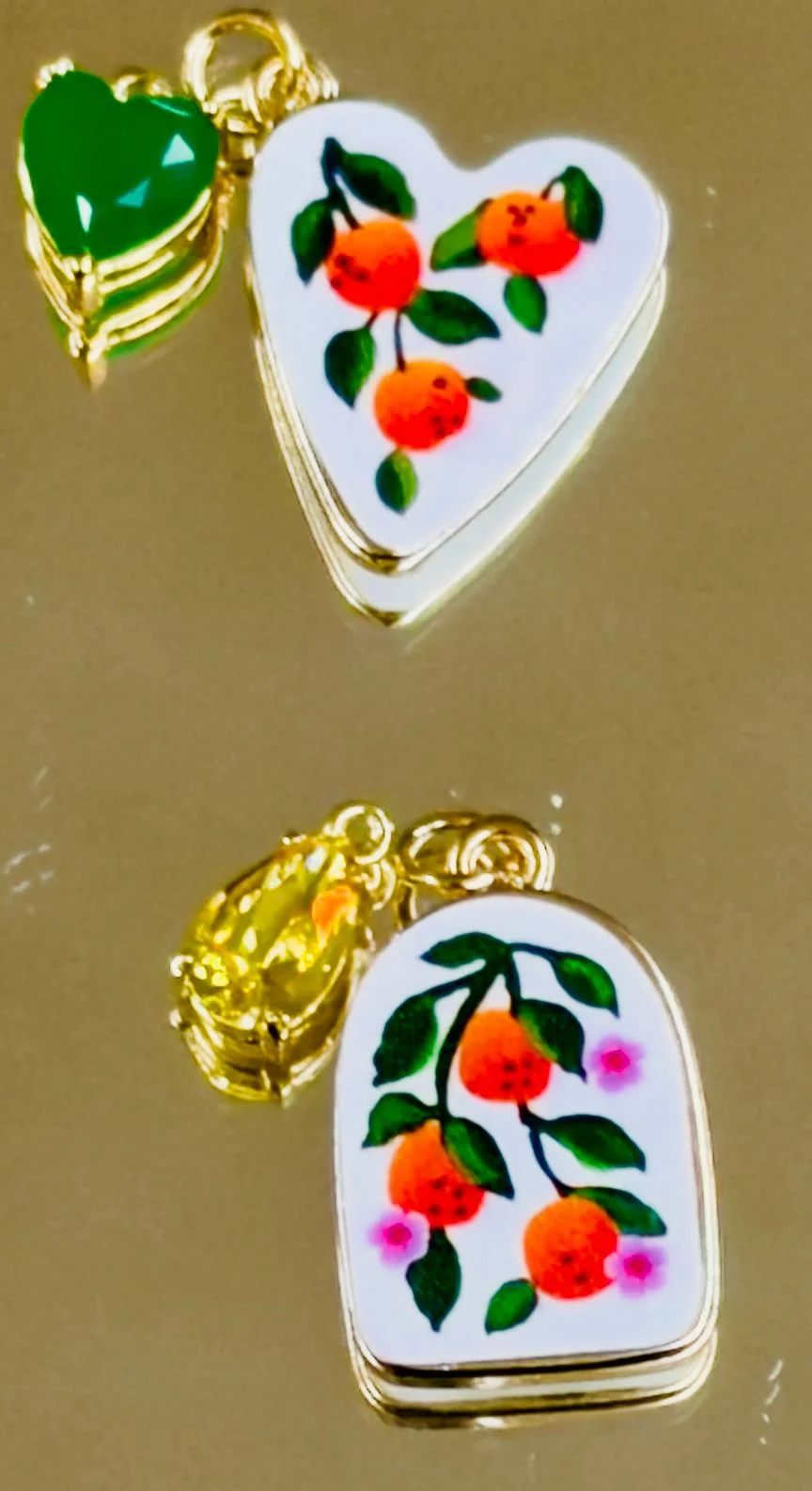 Un piccolo giardino da indossare: tre frutti arancioni circondati da foglie verdi e fiorellini rosa, dipinti a mano su fondo bianco.