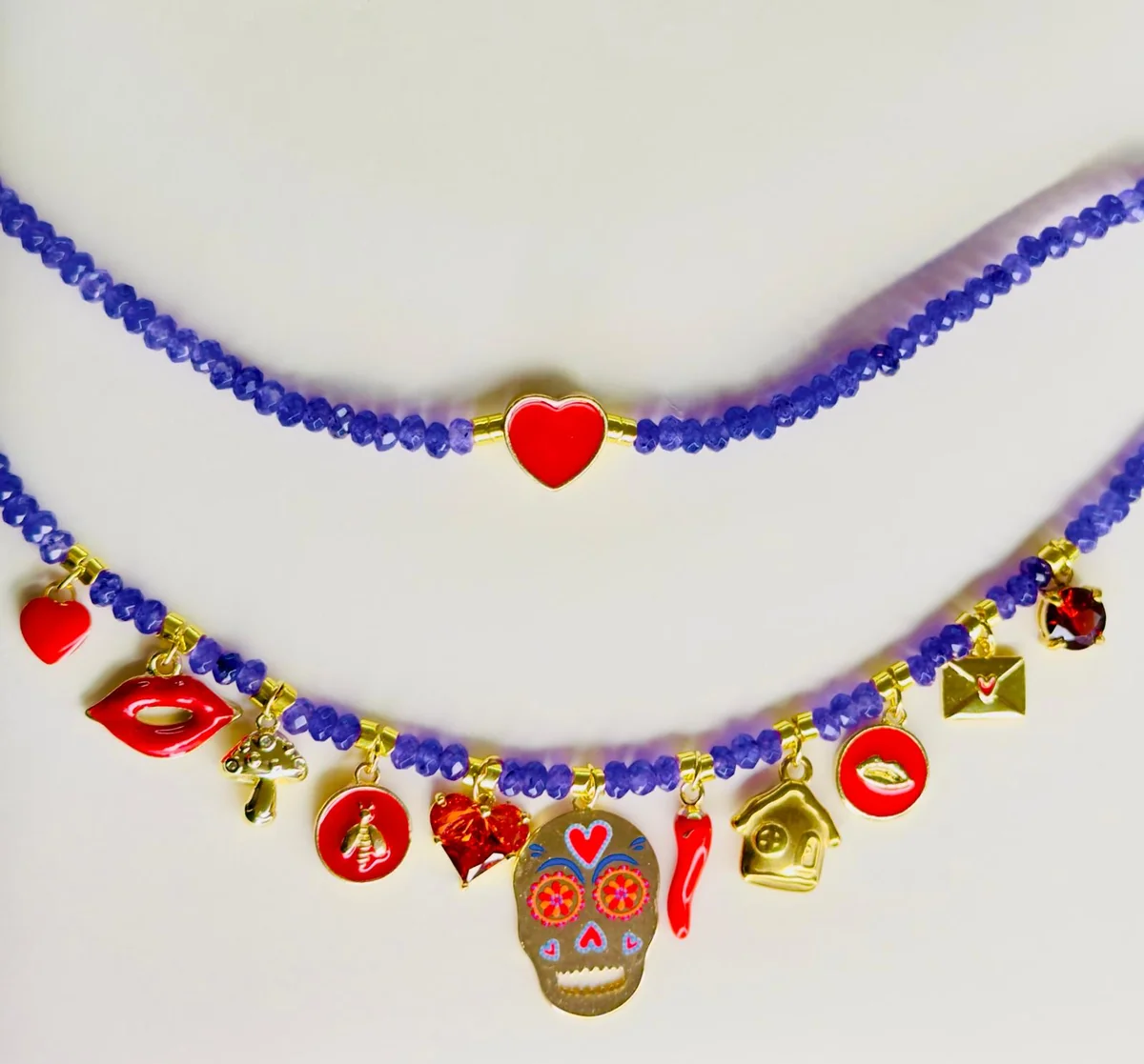 Una collana lunga e narrativa, con pietre viola e charms smaltati: cuore, labbra, funghetto, ape, cuore sfaccettato, teschio floreale, peperoncino, casa, busta con cuore…